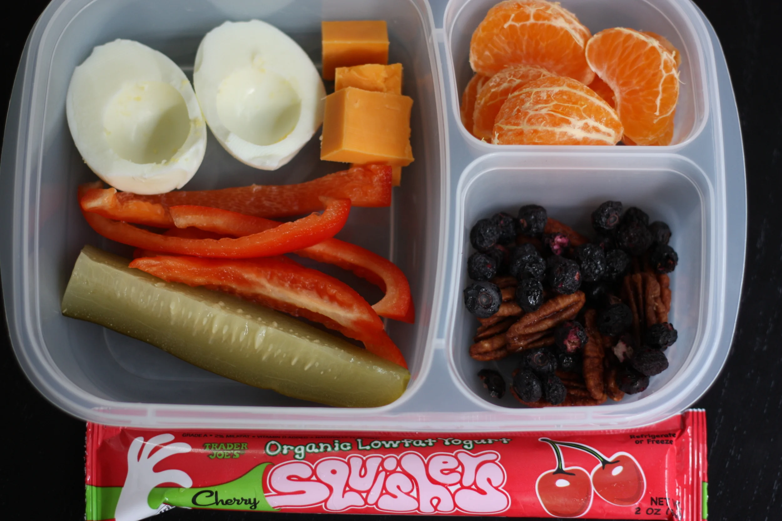 Hard boiled egg (yolk removed per Jack's request), cubed cheddar cheese, red pepper strips, pickle, clementine, pecans and dried blueberries, and yogurt squisher