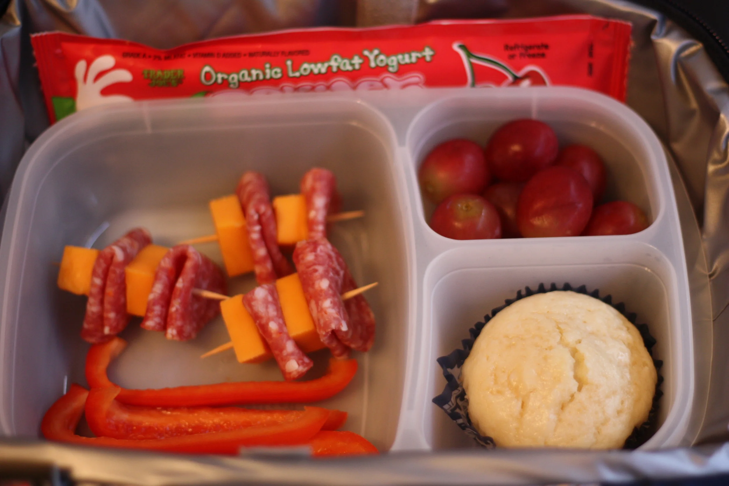 Cheddar cheese and salami kebabs, red pepper strips, yogurt squisher, red grapes, lemon ricotta muffin