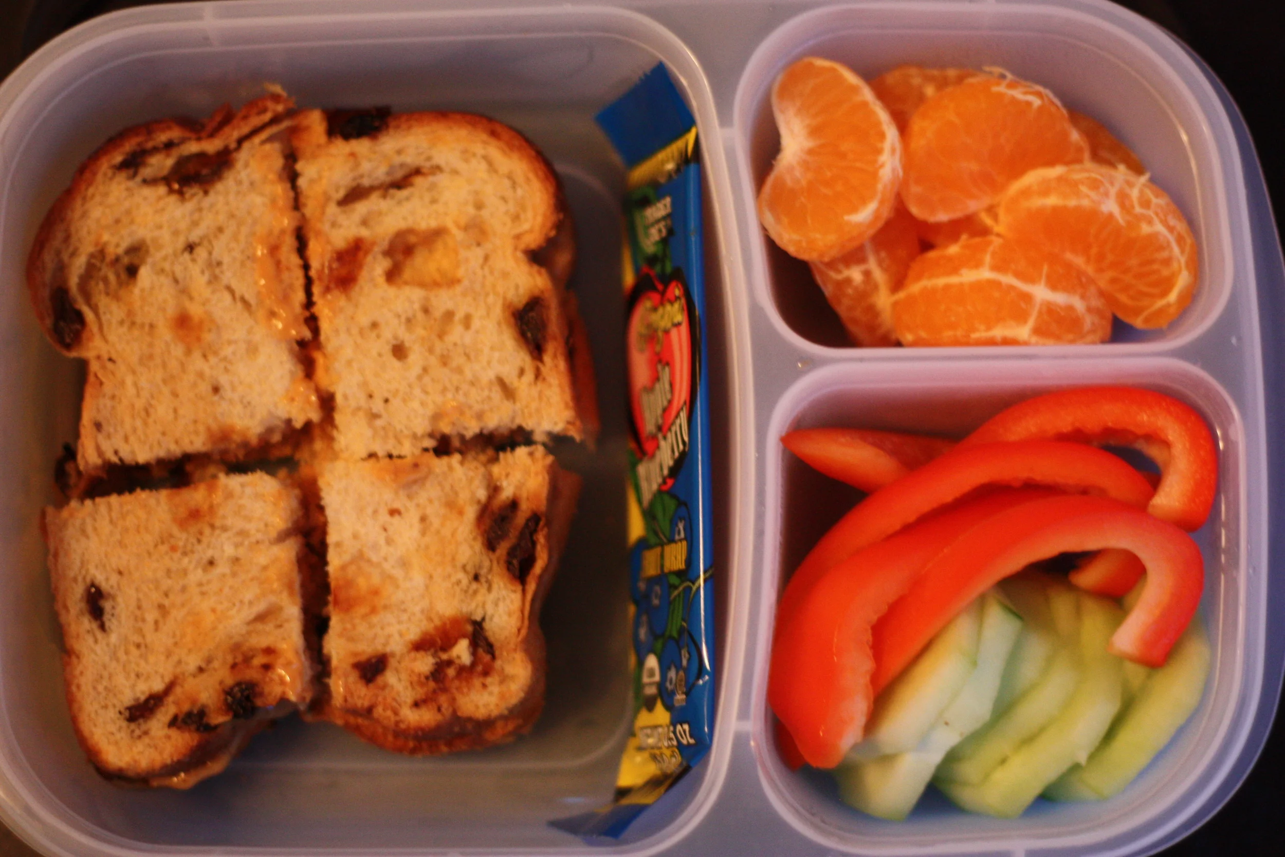 Peanut butter on raisin bread, apple-blueberry fruit strip, clementine, red pepper strips, peeled cucumber coins