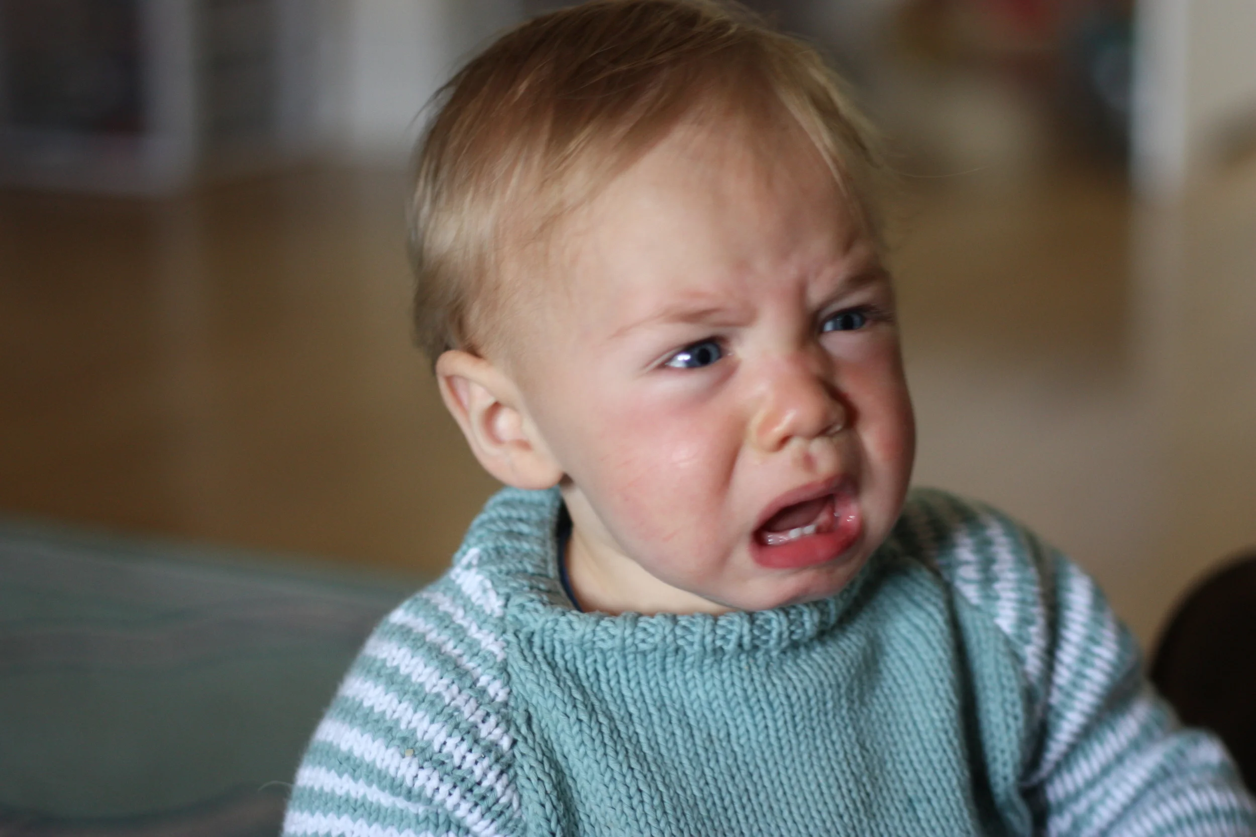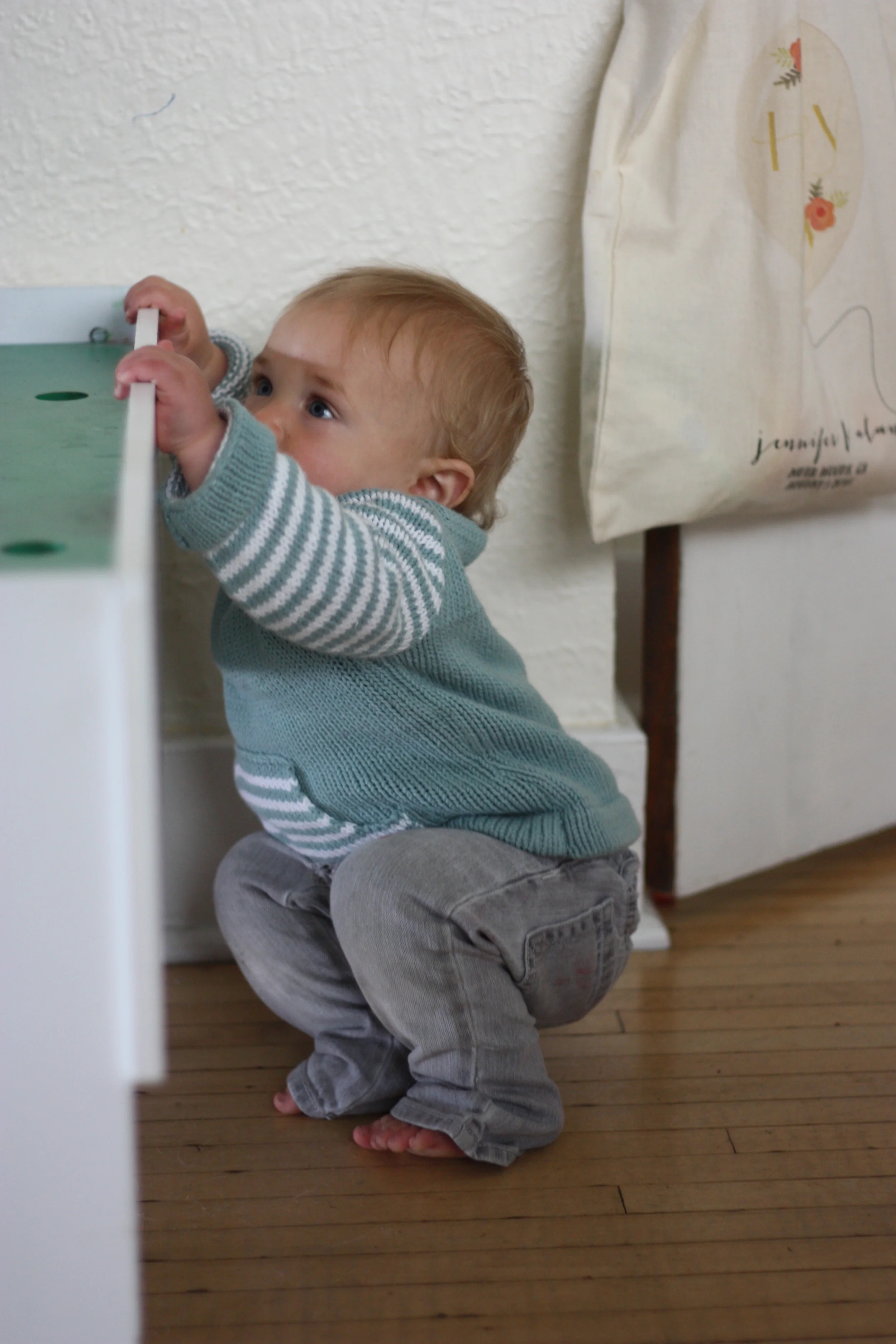 His crawl is text book perfect. Hand in front of hand legs following in perfect rhythm as he careens from room to room, usually trying to keep up with someone or making a mad dash for the bathroom, particularly the toilet, before we quickly swoop him up causing a pouty lip and a wail of protest. He actually gets his feelings hurt very easily and will cry when he has things taken away from him, when we close a door to shut him out, or when we say no.