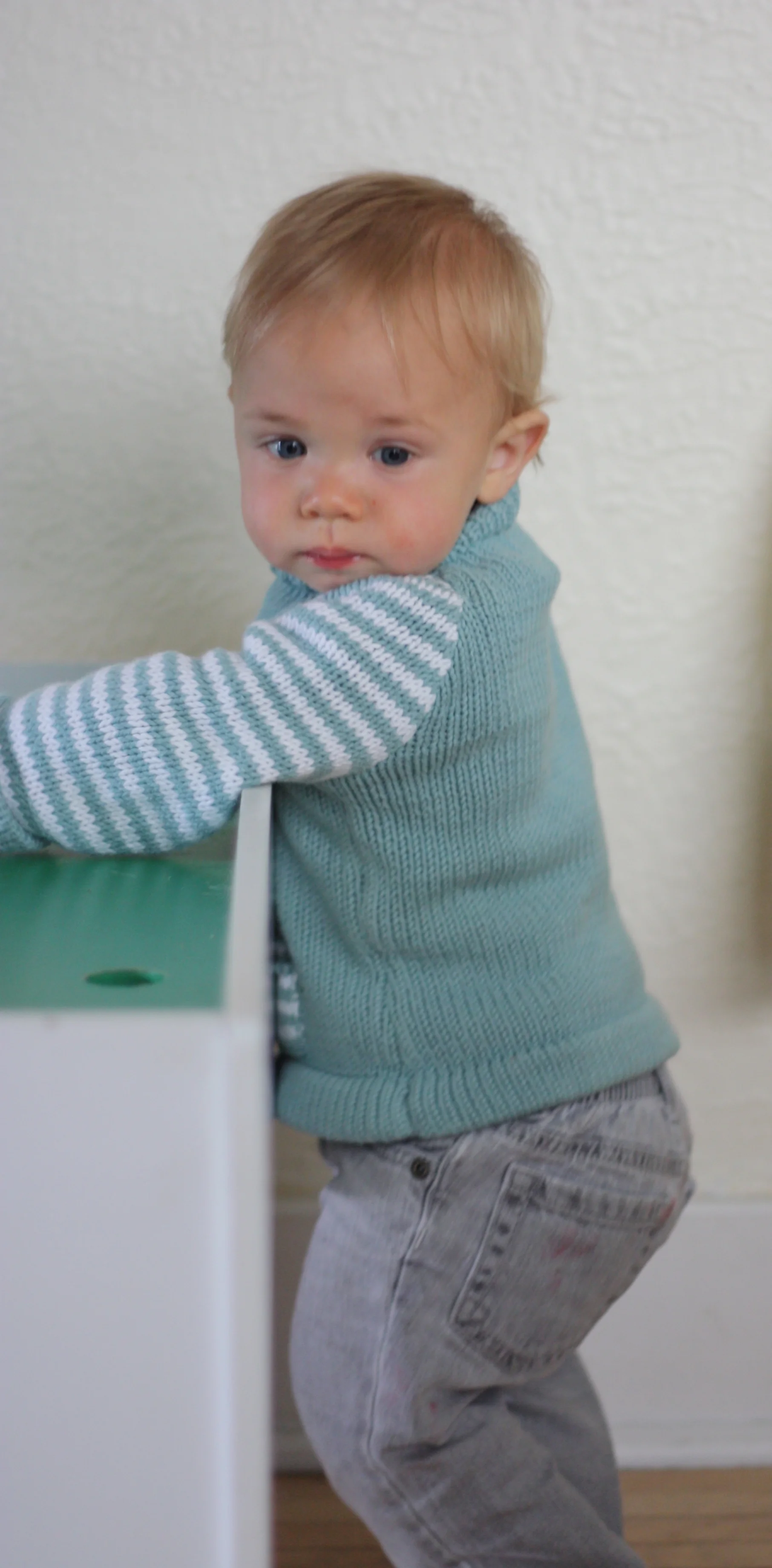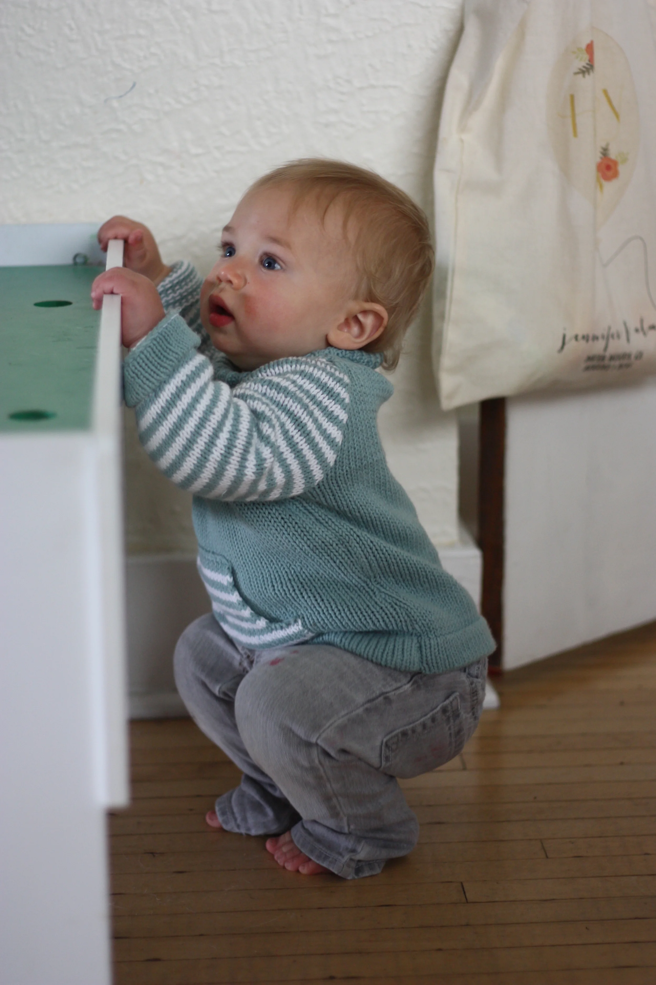 Despite his longing to always be on the move, Rigby has shown little interest in standing without assistance or in trying to walk. I guess his good crawl is effective enough in getting him to where he wants to go, although I can see him watch the bigger children on the playground with envy.
