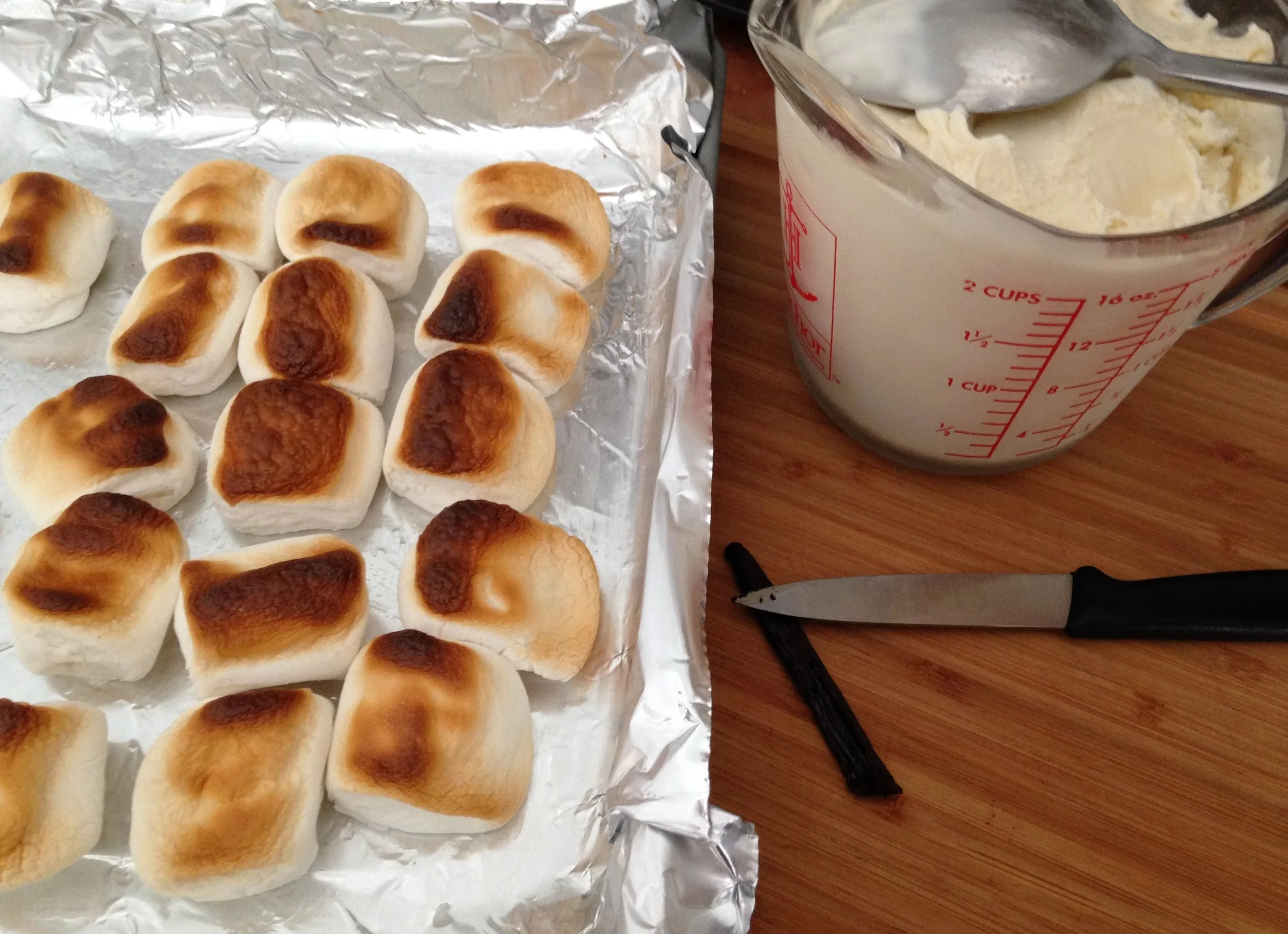 Place your glasses in the freezer. Heat the broiler of an oven, or better yet, toaster oven if you have one (less heat in the house during these sweltering days of summer). Line a baking sheet with foil and coat it lightly with a oil. Place marshmallows on the tray evenly and broil for about 2 minutes until they are the color that you like (keep a close eye on the marshmallows because as soon as they start to char they will take on color very quickly). Cool the tray in the freezer for 5 minutes, until marshmallows are no longer warm, then transfer broiled marshmallows to your blender.